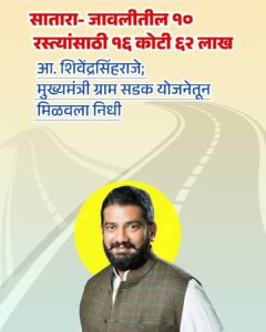 सातारा- जावली विधानसभा मतदार संघातील प्रत्येक गाव, वाडी, वस्ती डांबरी रस्त्याने जोडणाऱ्या आ. श्रीमंत छ. शिवेंद्रसिंहराजे भोसले यांच्या माध्यमातून सातारा आणि जावळी तालुक्यातील विविध रस्त्यांसाठी सातत्याने भरीव निधी उपलब्ध झाला आहे. आ. शिवेंद्रसिंहराजेंच्या माध्यमातून सातारा आणि जावली तालुक्यातील आणखी १० रस्त्यांसाठी मुख्यमंत्री ग्राम सडक योजना टप्पा क्र. २ मधून तब्बल १६ कोटी ६२ लाख १६ हजार रुपये निधी उपलब्ध झाला आहे.